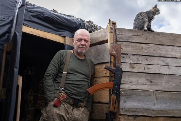 «Дід» (позивний) та його кіт біля бліндажу передової поблизу селища Кримське, Луганська область, 20 вересня 2021 року