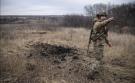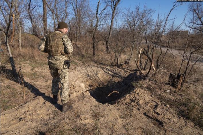 Український військовий оглядає вирву від 122-мм снаряду артилерії російських гібридних сил у селищі Болотяне, Луганська область, 23 листопада 2021 року