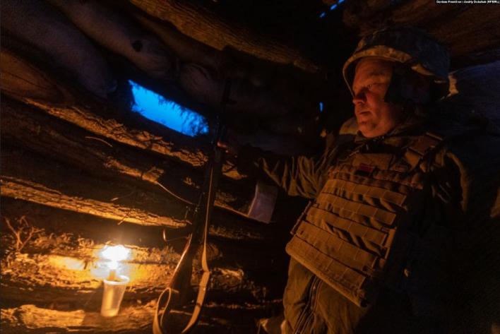 Свічка в пам'ять про загиблих під час Голодомору 1932–33 років на бойовій позиції української армії під містом Попасна, 26 листопада 2021 року