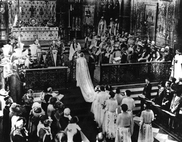 6. До вівтаря наречена йшла в сукні, авторкою якої стала придворна кравчиня Елізабет Гендлі-Сеймур. Пізніше вона створила і коронаційну сукню для Єлизавети 1937 року.