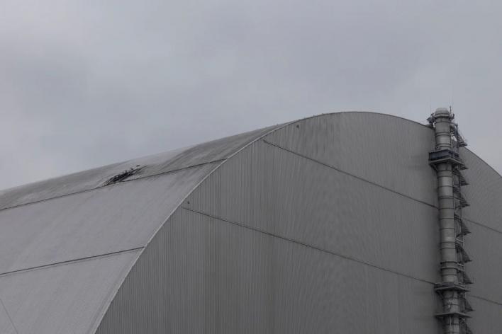 Загальний вигляд нового конфайнменту (укриття або нового «саркофагу») над зруйнованим четвертим енергоблоком ЧАЕС. На фото добре видно слід від удару шахедом, якого Росія завдала по цьому об'єкту у лютому 2025 року