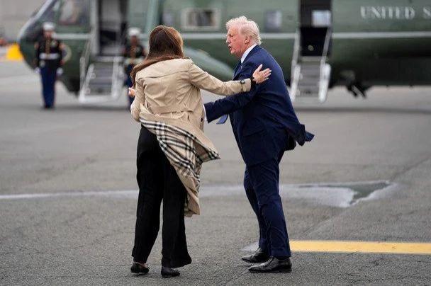 Перша леді для перельоту обрала улюблений класичний тренч від Burberry з фірмовою картатою підкладкою бренду. На ній також були чорні светр і широкі штани. Вбрання вона скомбінувала з чорними балетками з чорними пряжками від Roger Vivier.