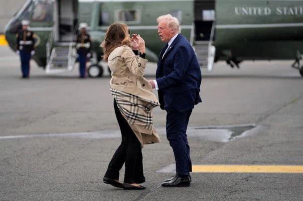 Перша леді для перельоту обрала улюблений класичний тренч від Burberry з фірмовою картатою підкладкою бренду. На ній також були чорні светр і широкі штани. Вбрання вона скомбінувала з чорними балетками з чорними пряжками від Roger Vivier.