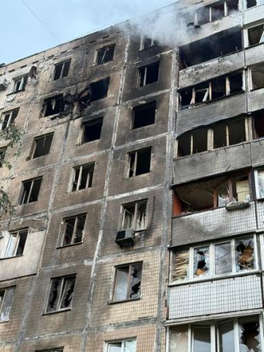 Дніпровський район. Дрон упав на багатоповерховий житловий будинок. Сталося часткове руйнування перекриття на 29-му та 30-му поверхах (загальний балкон). Без займання і постраждалих.