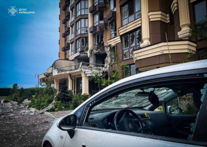 У ДСНС повідомили, що о 04:36 рятувальники отримали повідомлення про влучання у селі Софіївська Борщагівка під Києвом. Там внаслідок ворожої атаки дронів виникла пожежа, були зруйновані конструкції на 2-му поверсі десятиповерхового будинку в одному з житлових комплексів.