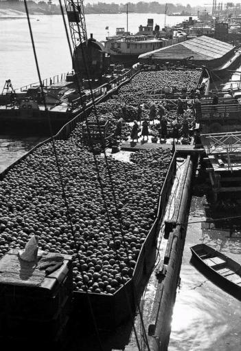 На опублікованих фото можна побачити, що смачну ягоду в ті роки перевантажували з баржі на авто вручну.