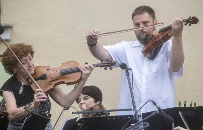 Валентина Ковальська, скрипка, та Юрій Маршалик, альт, на концерті другого дня фестивалю класичної музики «Струни старого Станиславова». Площа перед Івано-Франківської обласною філармонією імені Ірини Маланюк, Івано-Франківськ, 26.07.2025