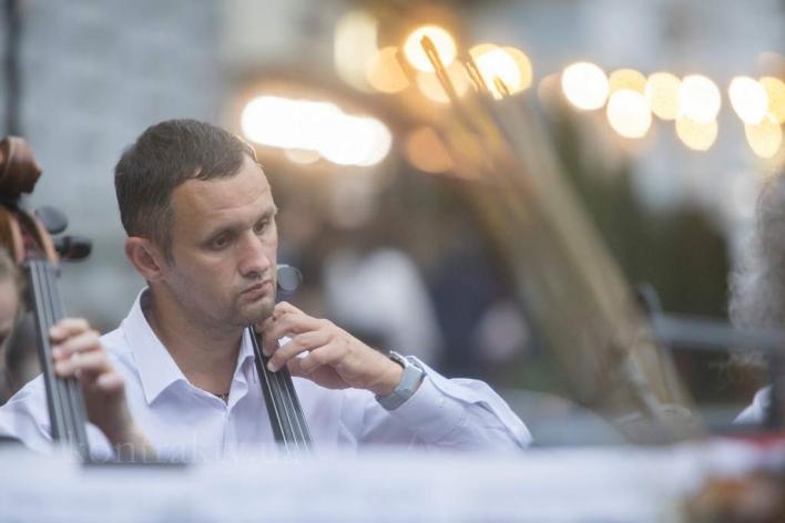 Любомир Дейчаківський, віолончель, на концерті другого дня фестивалю класичної музики «Струни старого Станиславова». Площа перед Івано-Франківської обласною філармонією імені Ірини Маланюк, Івано-Франківськ, 26.07.2025