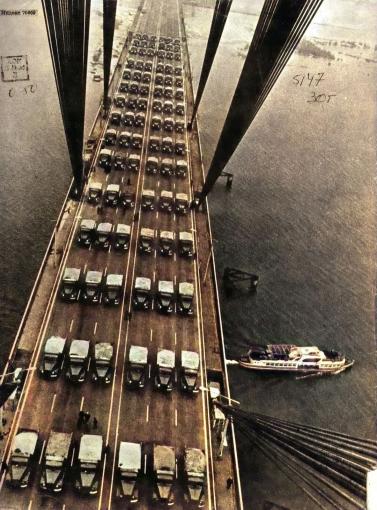 У мережі показали, як у 1976 році Північний міст Києва випробовували на міцність вантажівками. Унікальне фото