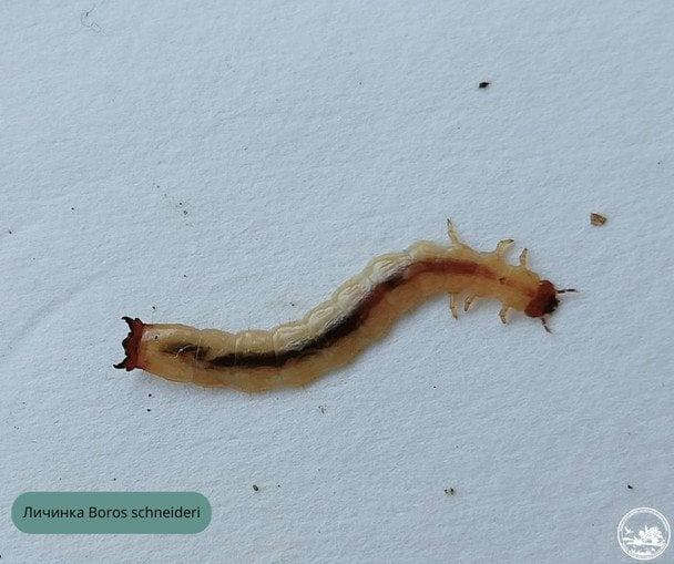 Личинки Борос Шнайдера легше помітити. Вони розвиваються під корою відмерлих сосен або інших дерев, за умови достатньої вологості деревини. Личинки мають напівпрозоре світло-коричневе тіло з темною смугою травної системи, коричневою головою та характерною “вилочкою” на останньому сегменті черевця. Вони заселяють ослаблені або мертві дерева, не завдаючи шкоди здоровим лісам.