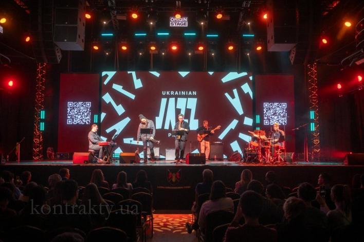 Зліва направо: Усеїн Бекіров, клавіші, Денніс Аду, труба, Борис Могилевський, саксофон, Мар'ян Карпінський, бас-гітара, Павло Галицький, барабани, виступають на концерті-презентації першої джазової премії Ukrainian Jazz Prize.