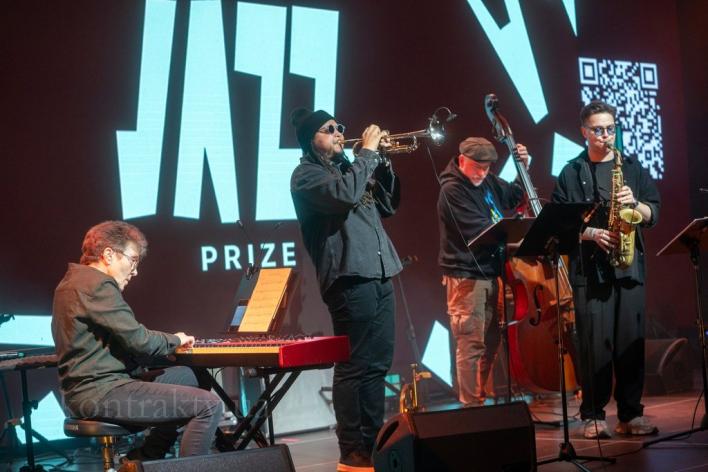 Зліва направо: Наталя Лебедєва, клавіші, Денніс Аду, труба, Марк Токар, контрабас, Борис Могилевський, саксофон, виступають на концерті-презентації першої джазової премії Ukrainian Jazz Prize.