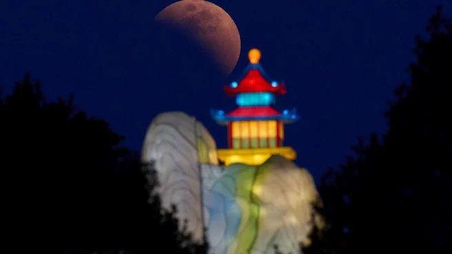 На піку повної фази затемнення Місяць набув глибокого іржаво-червоного відтінку. Такий колір з’являється через те, що сонячне світло заломлюється у щільних шарах атмосфери Землі, перш ніж досягти місячної поверхні.