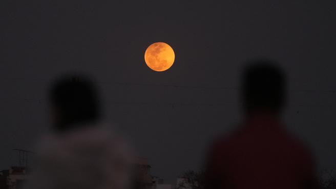Через заломлення світла в атмосфері Землі Місяць набув рідкісного іржаво-червоного відтінку.