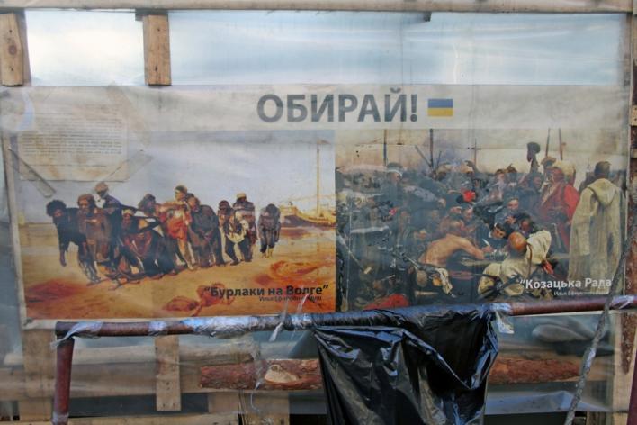 За время акций протеста на Майдане собралось большое количество плакатов, надписей и лозунгов. Практически все стены близлежащих домов, баррикады, новогодняя елка и все что окружает Майдан изобилует различной революционной "живописью".  Только посмотрев на них можно почувствовать атмосферу  событий, которые разворачиваются в самом сердце столицы вот уже нескольких месяцев. .