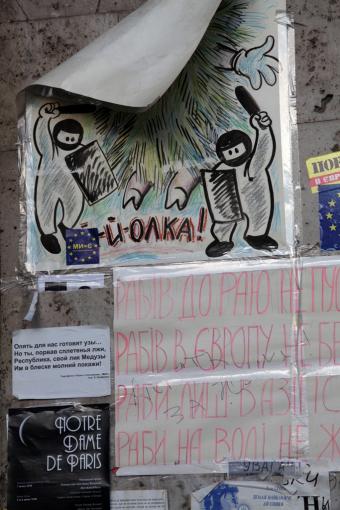 За время акций протеста на Майдане собралось большое количество плакатов, надписей и лозунгов. Практически все стены близлежащих домов, баррикады, новогодняя елка и все что окружает Майдан изобилует различной революционной "живописью".  Только посмотрев на них можно почувствовать атмосферу  событий, которые разворачиваются в самом сердце столицы вот уже нескольких месяцев. .