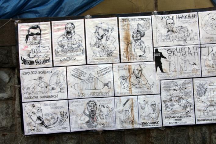 За время акций протеста на Майдане собралось большое количество плакатов, надписей и лозунгов. Практически все стены близлежащих домов, баррикады, новогодняя елка и все что окружает Майдан изобилует различной революционной "живописью".  Только посмотрев на них можно почувствовать атмосферу  событий, которые разворачиваются в самом сердце столицы вот уже нескольких месяцев. .