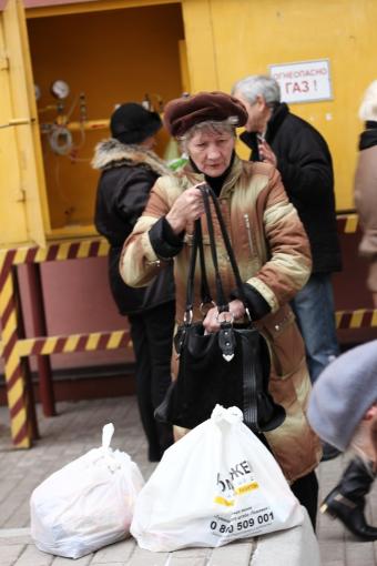 На фото раздача гуманитарных наборов от Рината Ахметова в Калининском районе Донецка 11 ноябя 2014 года.