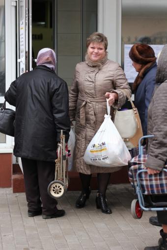 На фото раздача гуманитарных наборов от Рината Ахметова в Калининском районе Донецка 11 ноябя 2014 года.