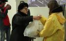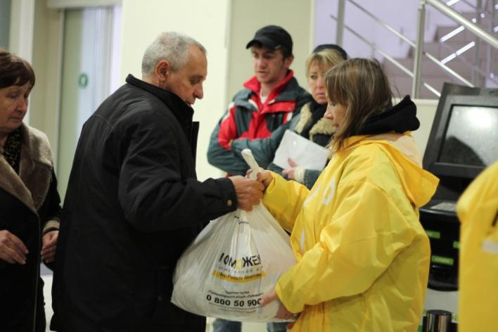 На фото раздача гуманитарных наборов от Рината Ахметова в Калининском районе Донецка 11 ноябя 2014 года.