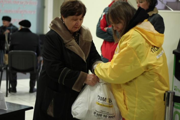 На фото раздача гуманитарных наборов от Рината Ахметова в Калининском районе Донецка 11 ноябя 2014 года.