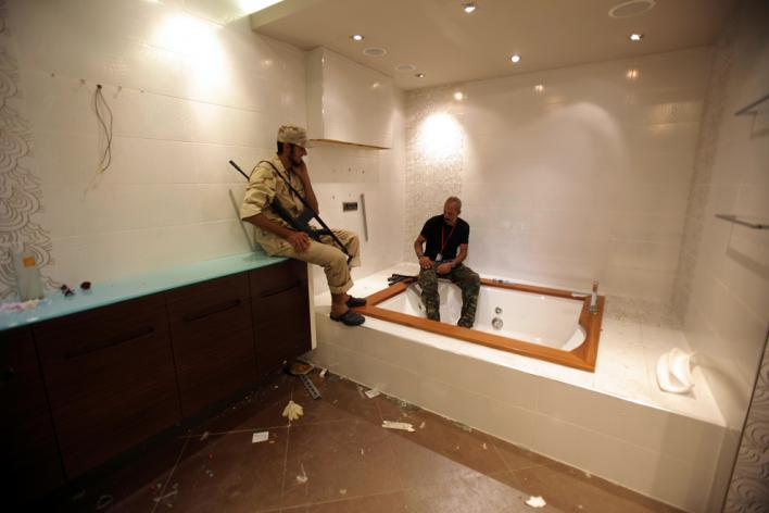 Ванная в доме Муатассима Каддафи была почти полностью разграблена, но повстанцы нашли нетронутый уголок и отдыхают в джакузи (Patrick Baz/AFP/Getty Images)