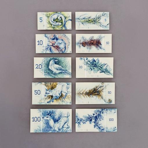 С одной стороны купюры расположены животные, а с другой растения. Сама купюра с увеличением номинала увеличивается в размере. Так же художница поделилась процессом создания купюр на сайте Behance.net