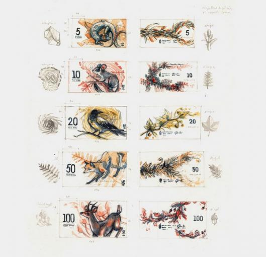 С одной стороны купюры расположены животные, а с другой растения. Сама купюра с увеличением номинала увеличивается в размере. Так же художница поделилась процессом создания купюр на сайте Behance.net