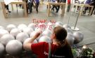 Апполин Арно, 12 лет, соседка Стива Джобса, пишет послание на стене напротив его дома в Пало Альто, Калифорния, 5 октября 2011 года. (AP Photo/Paul Sakuma)