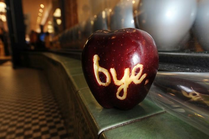 Яблоко с надписью "прощай" рядом с магазином Apple, оставленное прохожим в знак памяти об основателе компании, Пасадена, Калифорния. (ROBYN BECK/AFP/Getty Images)