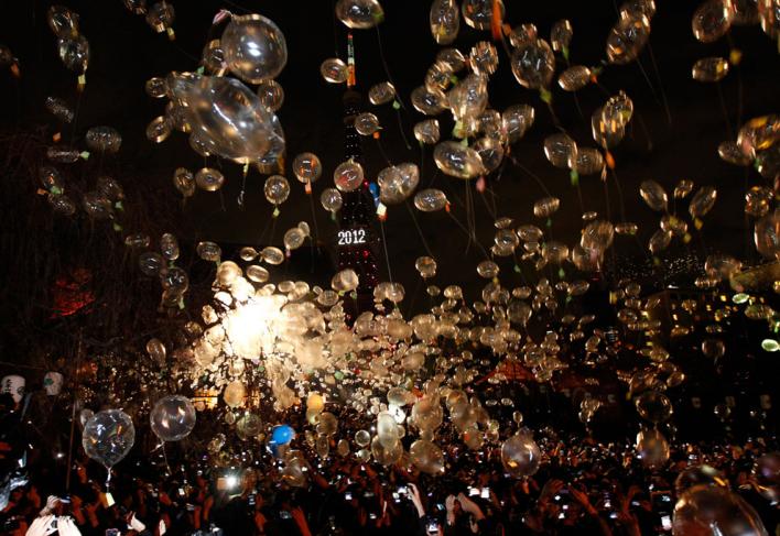 Люди запускают шарики в честь нового года в Токио, 1 января 2012 года. (Reuters/Kim Kyung-Hoon)