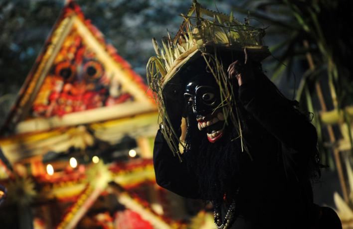 Танцор в народном костюме и маске в Коломбо, Шри-Ланка, 31 декабря 2011 года. Церемония предназначена, чтобы защититься от злых духов в новом году. (Ishara S. Kodikara/AFP/Getty Images)