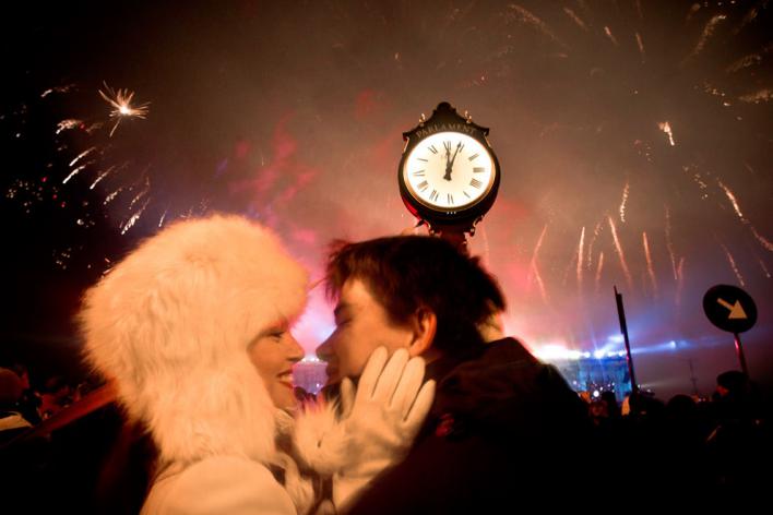Пара целуется во время фейерверка в Бухаресте, Румыния, 1 января 2012 года. (AP Photo/Vadim Ghirda)