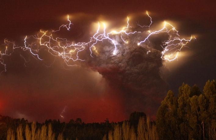 Молнии бьют в столб пепла, поднимающийся над вулканом Пуйеуэ, Чили, 5 июня 2011 года. Вулкан, спавший несколько десятилетий, вновь пробудился, и его извержение повлекло за собой выброс огромной массы пыли в небо. Несколько тысяч жителей Аргентины, куда ветер нес пыль и пепел, были эвакуированы. (Reuters/Carlos Gutierrez)