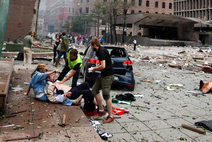 Раненому мужчине оказывают помощь после взрыва в центре Осло, 22 июля 2011 года. Мощный взрыв повредил здания правительства, в том числе кабинет премьер-министра Йенса Штольтенберга. ОТ взрыва вылетели окна в зданиях министерств, в одном начался пожар, было ранено несколько людей. (Reuters/Per Thrana)