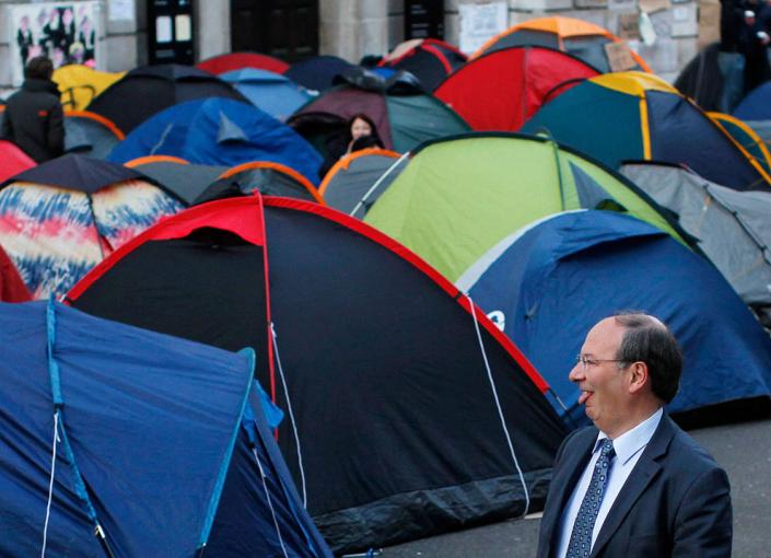 Бизнесмен показывает язык, проходя мимо палаточного лагеря демонстрантов рядом с Собором св. Павла в Лондоне, 17 октября 2011 года. (AP Photo/Matt Dunham)
