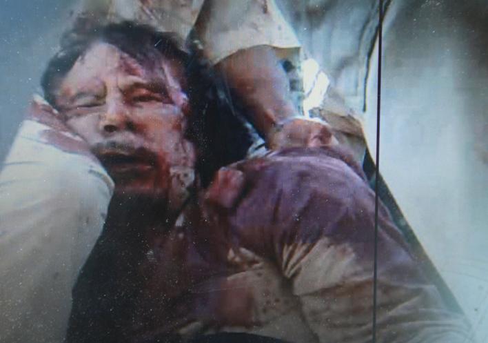 Залитое кровью лицо Муаммара Каддафи, стоп-кадр из видео, снятого в Сирте, Ливия, 20 октября 2011 года. Со смертью Каддафи и захватом Сирта революционные лидеры объявили об окончании гражданской войны. (Reuters/Esam Al-Fetori)