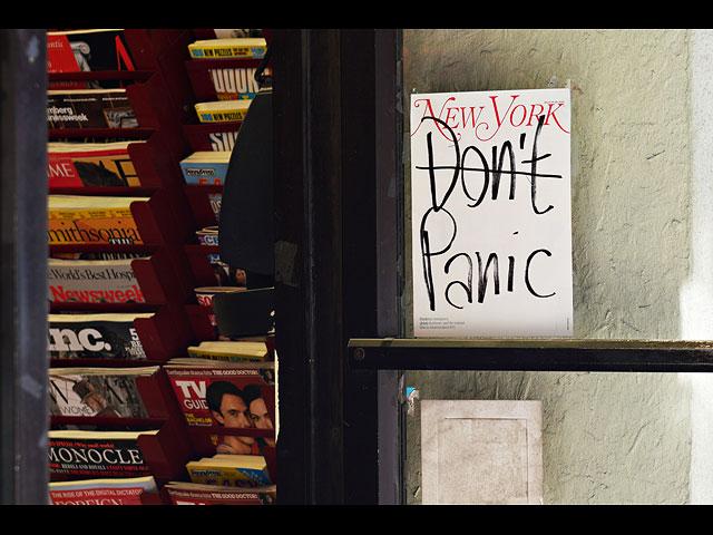 Надпись Без паники, при входе в книжный магазин. Нью-Йорк, 15 марта